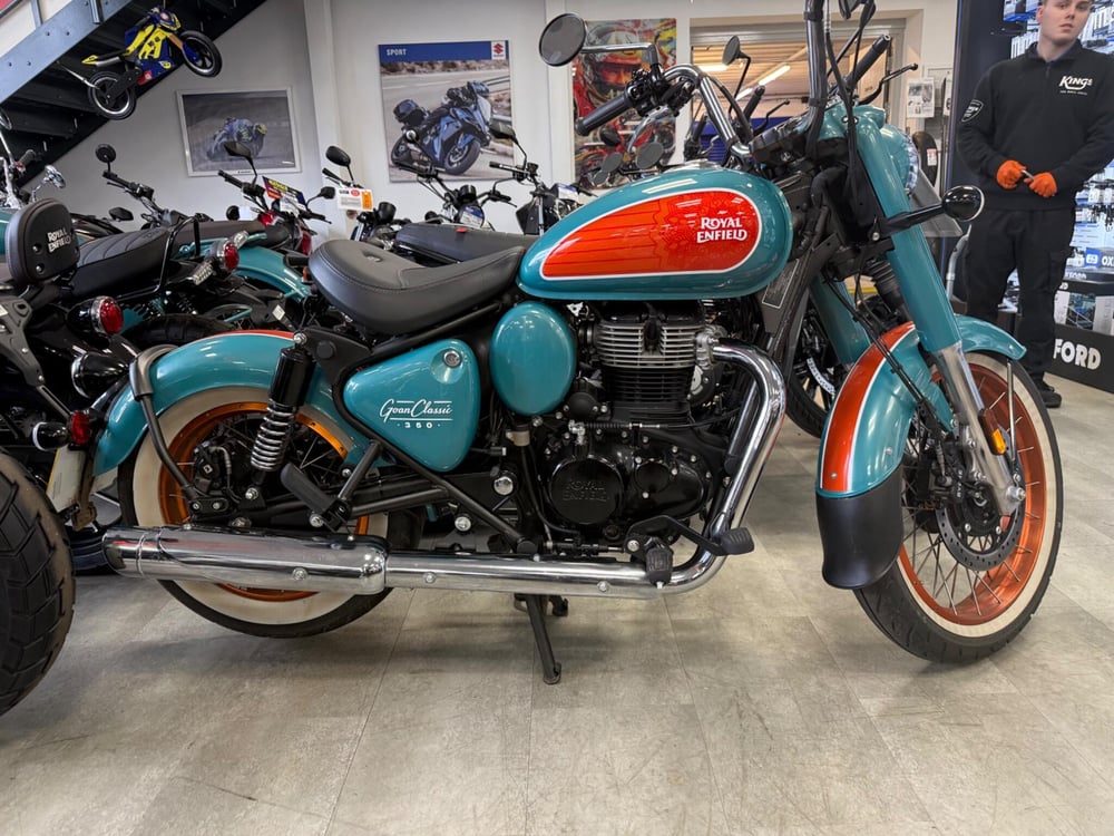 Here we have this very different style love or hate , but certainly a head turner for a bike event , The Royal Enfield goan 350 come with a back seat , only 300 miles just as new 1st service done , save 500 on new